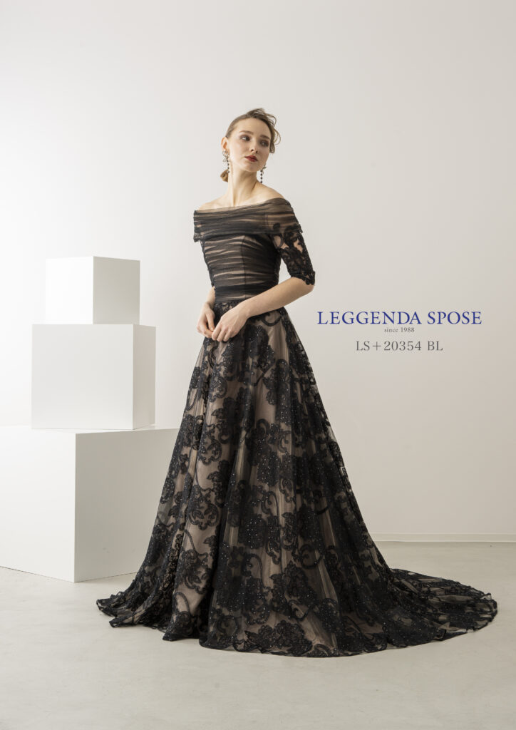 ブラックチュールのオフショルダースリーブのカラードレス。ブラック一色ではなく、ショルダーとスカートにインパクトのあるフラワーモチーフを施した上品な一着。ベースドレスをベージュし、ブラックをより引き立てるデザインは今までのブラックドレスとは一味違うシックで高級感漂うテイスト。