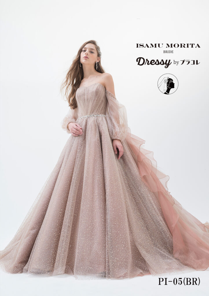 トレンドのヌーディーカラーのドレスは、花嫁様を虜にする一着。抜け感のあるロングパフスリーブは、可愛らしさの中にも存在感のあるデザイン。ドレス全体に施された、きめ細やかなグリッターは大きな披露宴会場にも映えること間違いなし。