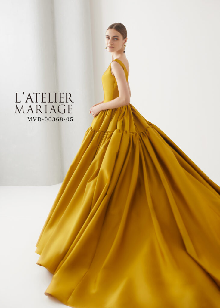 スカートの切り換えしから広がるボリュームラインとフロントデザインとは違う対照的に開いた背中のライン、深みのあるマスタードカラーは360度どの角度から見てもお洒落なカラードレス。