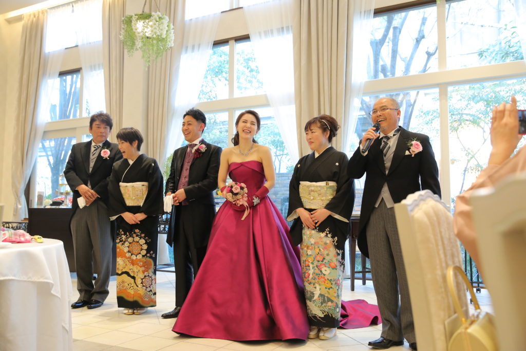レストランやゲストハウスなど、カジュアルなスタイルでの披露パーティなら準礼装で合わせてバランスを取るのも素敵です。お二人のパーティーのイメージに合わせ、両家で相談するのが大切です。