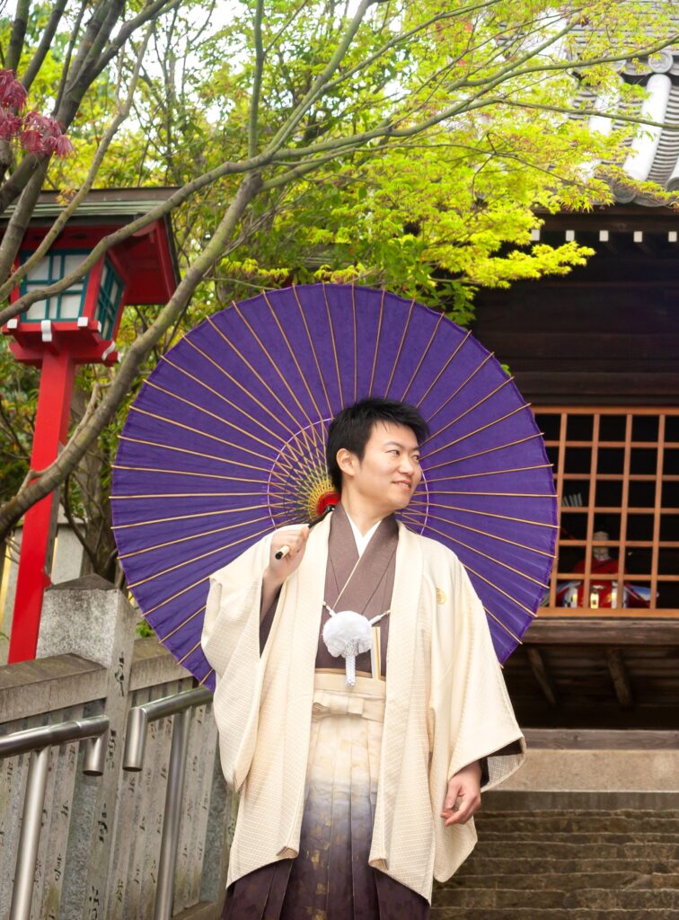 新郎様が着用される紋付羽織袴は黒色だけではなく、色もあります。紺・紫・ブラウン・ベージュなどの紋付羽織袴があり、新婦様が着用される色打掛に合わせて新郎様も鮮やかに雰囲気を変えてみては。