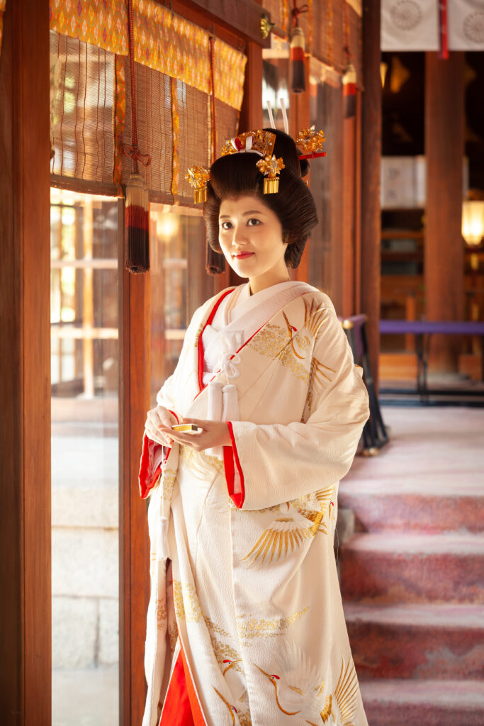 色打掛は挙式(神前式)後、披露宴で着用されることが一般的です。白無垢の厳粛な雰囲気とは違い、色打掛は色鮮やかで華やかな色合いが特徴です。懐剣・筥迫・末広・草履・髪飾りなどの小物も色打掛の色味に合わせて選ぶことをお勧めします。