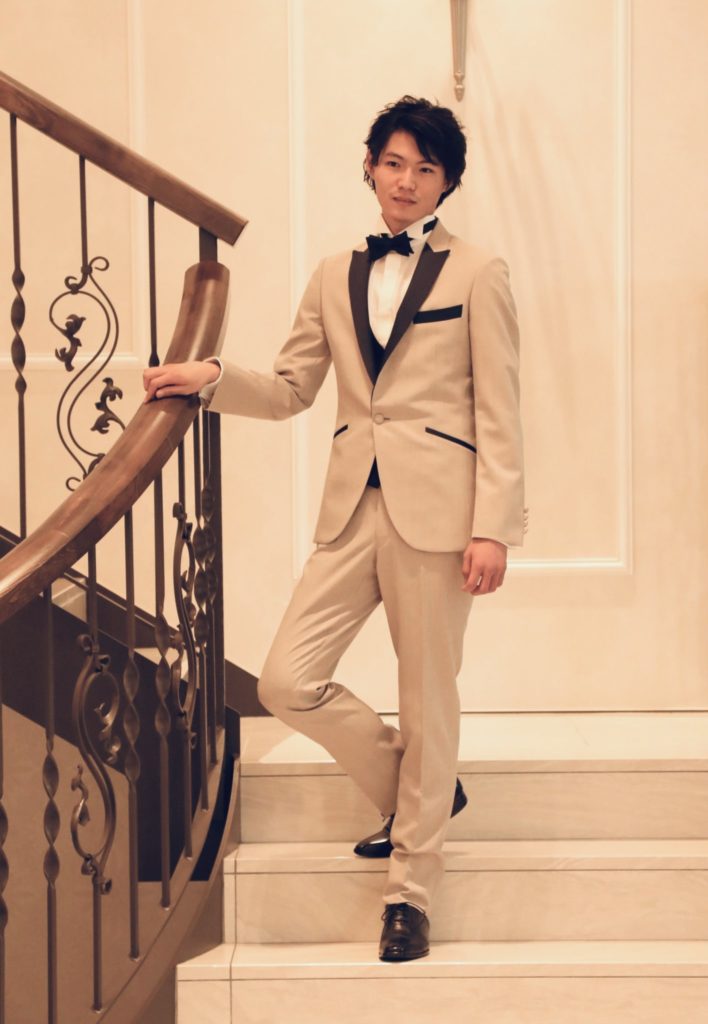 マットなサンドベージュに拝絹のネイビーが映える、ファッション性の高いタキシードは「みんなと一緒は嫌。」そんな新郎様にお勧めの一着です。ベスト・蝶ネクタイもネイビーで合わせることで、カジュアルになり過ぎず上品な印象を与えます。