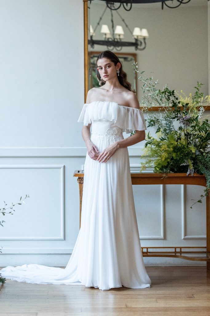 軽やかなジョーゼットの柔らかさを活かしたスウィートなドレス。シルク素材ならではの上品な光沢感は大人な花嫁様を演出します。トレンド感漂うラッフルのオフショルダーは、取り外し可能な2wayで楽しむことができる1着です。