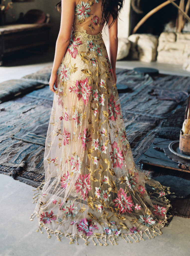 デザイナー:Claere Pettibone(クレア ペッティーボーン)のカラードレスが遂に入荷。メタリックゴールドのラバーレースを重ねたマルチカラーの刺繍は、幻想的なボヘミアンスタイルをお楽しみいただける一着。ゴールド系アクセサリーでエレガントに、エスニック風アクセで個性的に。小物アレンジで雰囲気を変えてMyスタイルを見つけて下さい。
