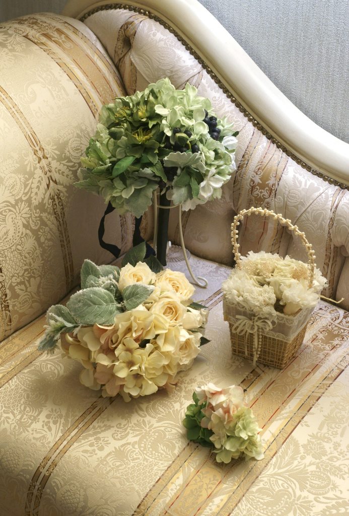 柔らかいイエローのアジサイを使ったクラッチブーケは、カジュアルなお式にしたいお二人にお勧め。「イメージはカジュアル。でもみんなと同じ雰囲気はいや・・・」そんな花嫁様は、かごタイプのブーケはいかがでしょう。軽やかなチュールのドレスやパーティースタイルにもお勧めです。ぜひ福茂で自分だけのこだわりのブーケを探してみませんか