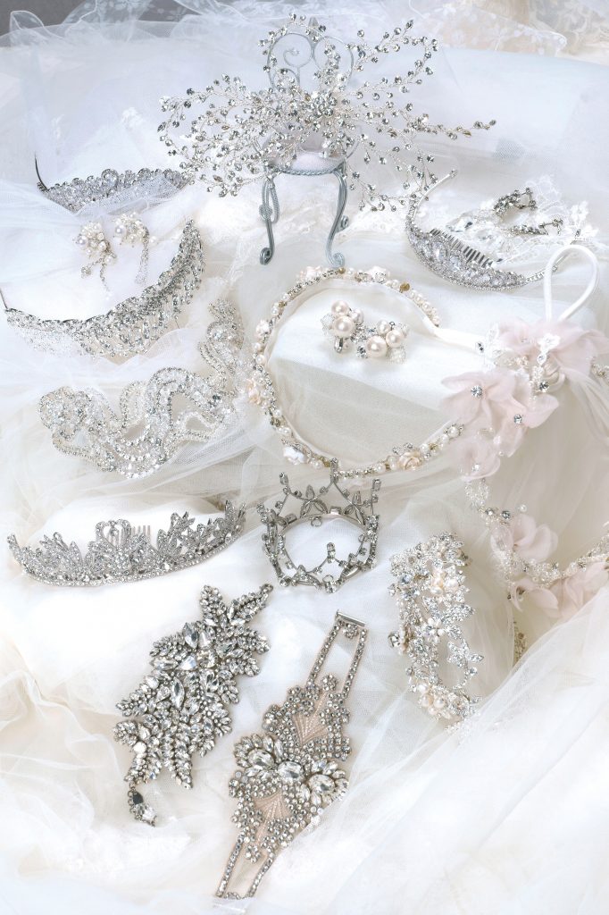運命の一着をより洗練された雰囲気に…素敵にアレンジいたしましょう!身につけるアクセサリーや髪飾りで、ドレス姿はもっともっと素敵に輝きます!アクセサリー等の小物は、ドレス選びのとても大きなポイントです。福茂では様々なご要望にお応えできるよう、豊富なラインナップの小物を取り揃えております。キラキラと輝く、≪シルバー≫のビジューをあしらったティアラやカチューシャ、ブレスレットは、花嫁の美しさに、より一層洗練された輝きを与えます。軽やかな印象のドレスや、リゾートウエディングにお勧めです。