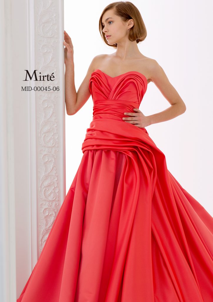 シンプルなAラインと大胆なデザインは、ファッションを知り尽くした女性にお勧めしたいドレス。みずみずしい果実のようなビタミンカラーは、花嫁のオークル系の肌色を、ひと際美しく魅せます。胸元のハートネックからスカートにかけてのタッキングのみで美しく作り出すドレープが、モード感を際立たせるスタイリッシュで美しい一着。カッコよく、そしてエレガントに着こなしたい、個性的な花嫁にお勧めしたいドレスです。ご披露宴は、いつもと違う自分に変身してみてはいかがでしょう。