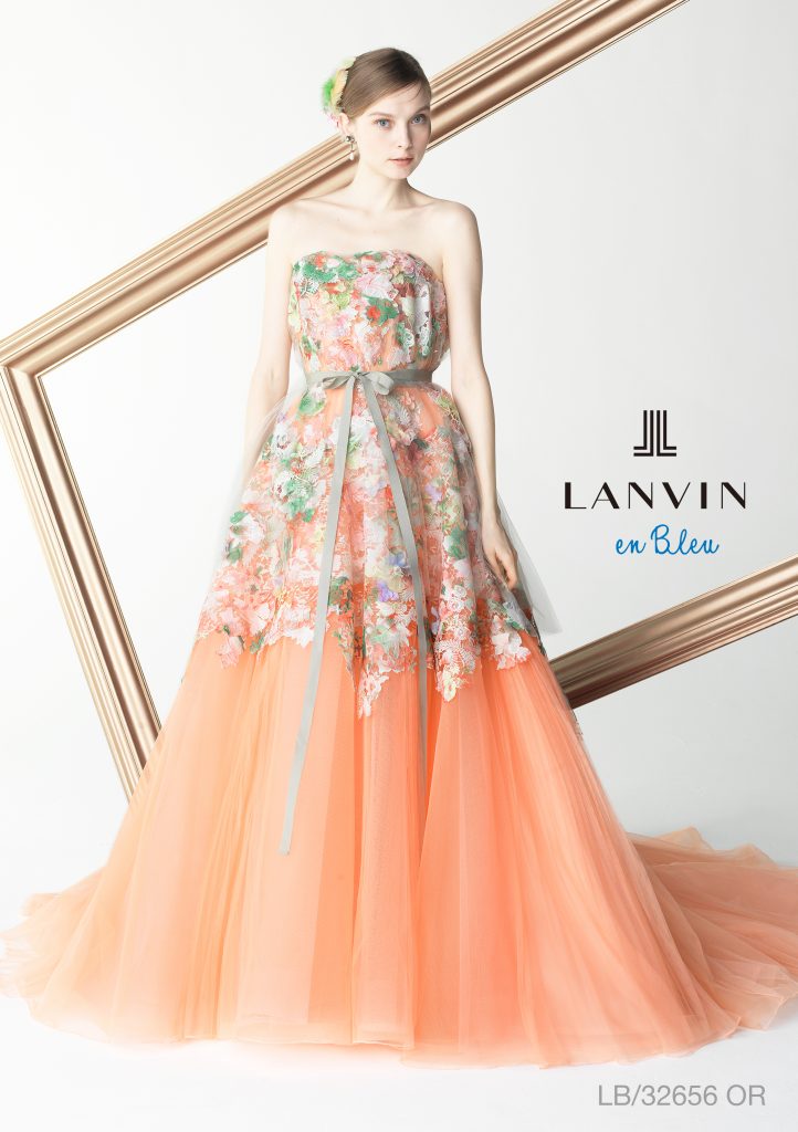 ファッションの本場、パリのエッセンスにエスプリを加味したファッショナブルな『LANBIN』のカラードレス。サーモンオレンジの柔らかなチュールに、ナチュラルカラーを乗せたボリュームのあるケミカルレースの組み合わせは、ガーデンパーティーとの相性もピッタリです。ウエストリボンや胸元から流れるチュールスカートは、取り外し可能です。あなたらしいスタイルを探してみて下さい。