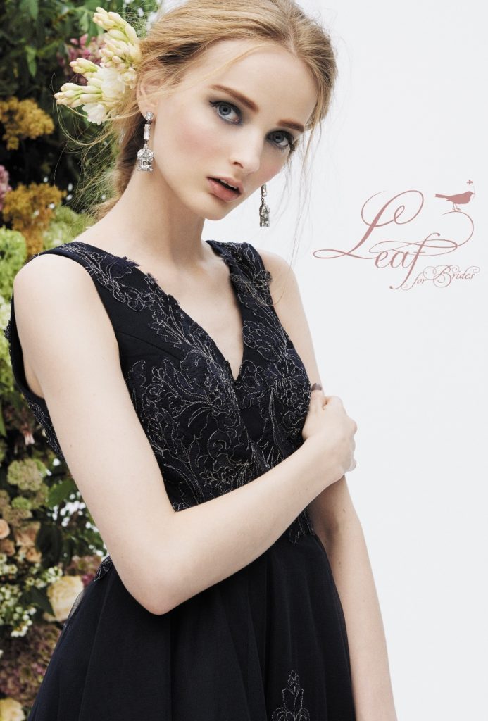 すべては日本の花嫁様の為に…今都会の花嫁様に人気の「リーフ・フォー・ブライズ」のカラードレス。トレンドを上手く取り入れた、女性心をくすぐるディテールはこのブランドならではの魅力です。シックなネイビーにあしらわれたシルバーのフラワーレースがモダンな印象に。深めのVネックが、デコルテを一段と綺麗に見せてくれることでしょう。結婚式のテーマを“ラグジュアリー”にしたいとお考えのお洒落に敏感な花嫁様にお勧めしたい一着です。
