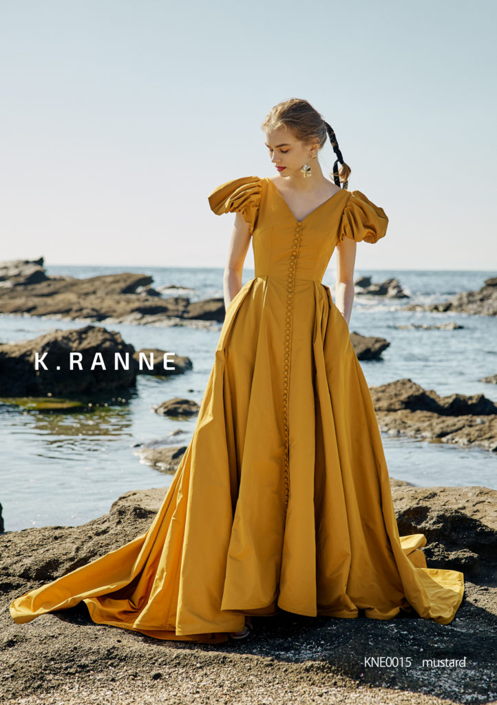 タフタならではの立体感のあるパフスリーブがポイントのカラードレス。胸元から裾まであしらわれたフロントのクルミボタンが王道とは違うカジュアルなスタイルを楽しめる一着。トレンドのマスタードカラーを周りとは一味違うテイストで着こなしたい方にお勧めです。