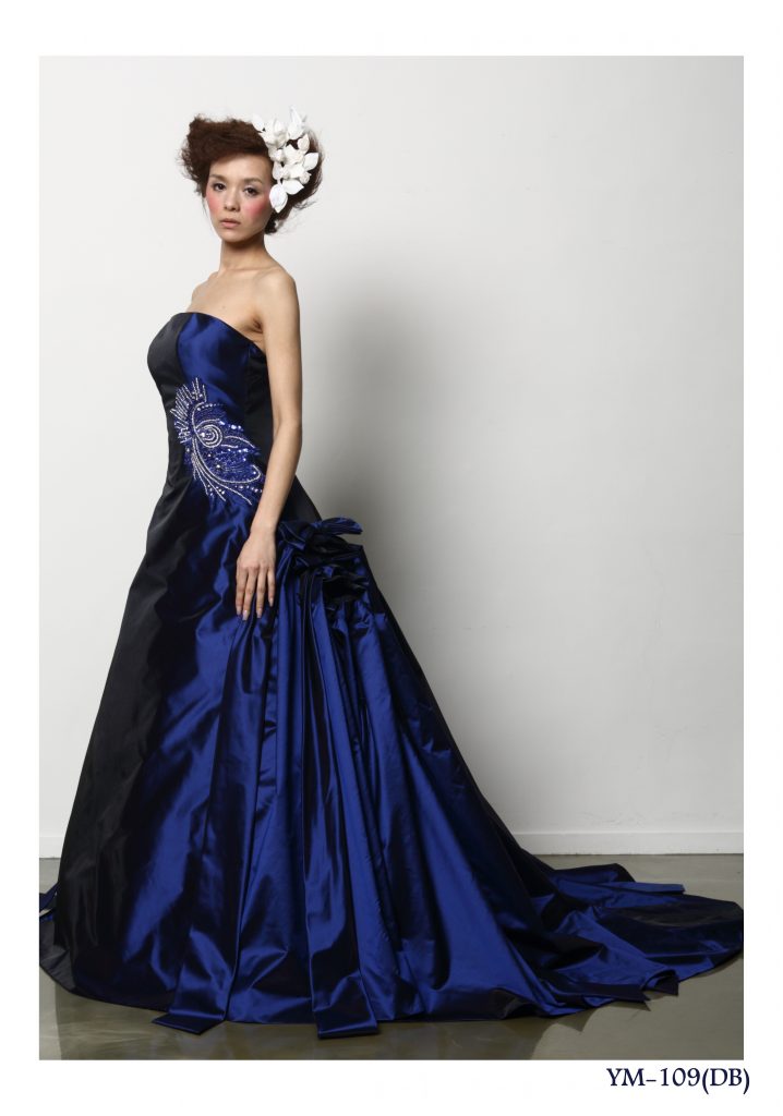 イタリア・フィレンチェの個展で注目を集める日本人デザイナーブランド『KABU9』は、日本人の体型に合わせたデザインが美しい。光沢のあるダークブルーの陰影が美しく、ウエストをマークするシルバーとブールのビジューアートが印象的で、見る人の心を魅了します。また、ウエストのシルバービジューと同系色のアクセサリーで、ドレスにスパイスを与え、クールな女性をイメージさせるようなコーディネートは、いかがでしょう。