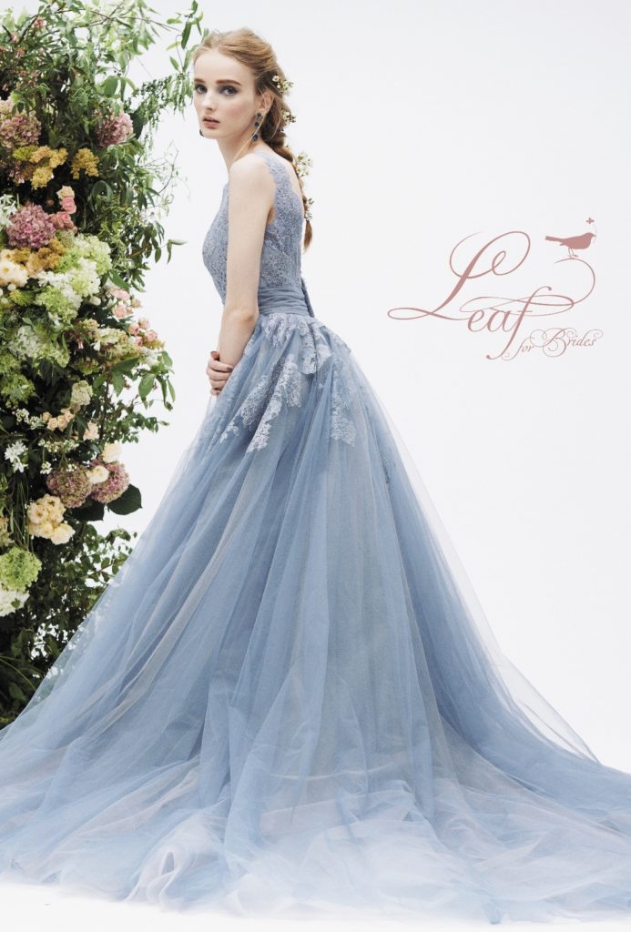 ブルー・グレー・ホワイトの多色使いのチュールレースを重ね合わせる事で生まれる独特のニュアンスカラーは山城葉子プロデュース『リーフ・フォー・ブライズ』のオリジナルカラー。ノースリーブトップスとスカートにふんだんに施されたリバーレースは上品で女性らしい花嫁様をより一層、優雅な雰囲気にしてくれます。ノースリーブトップス、チュールレース、ブルーグレー…トレンドを詰め込んだドレスで特別な日だからこそ、他の花嫁様に差をつけてみてはいかがでしょう。