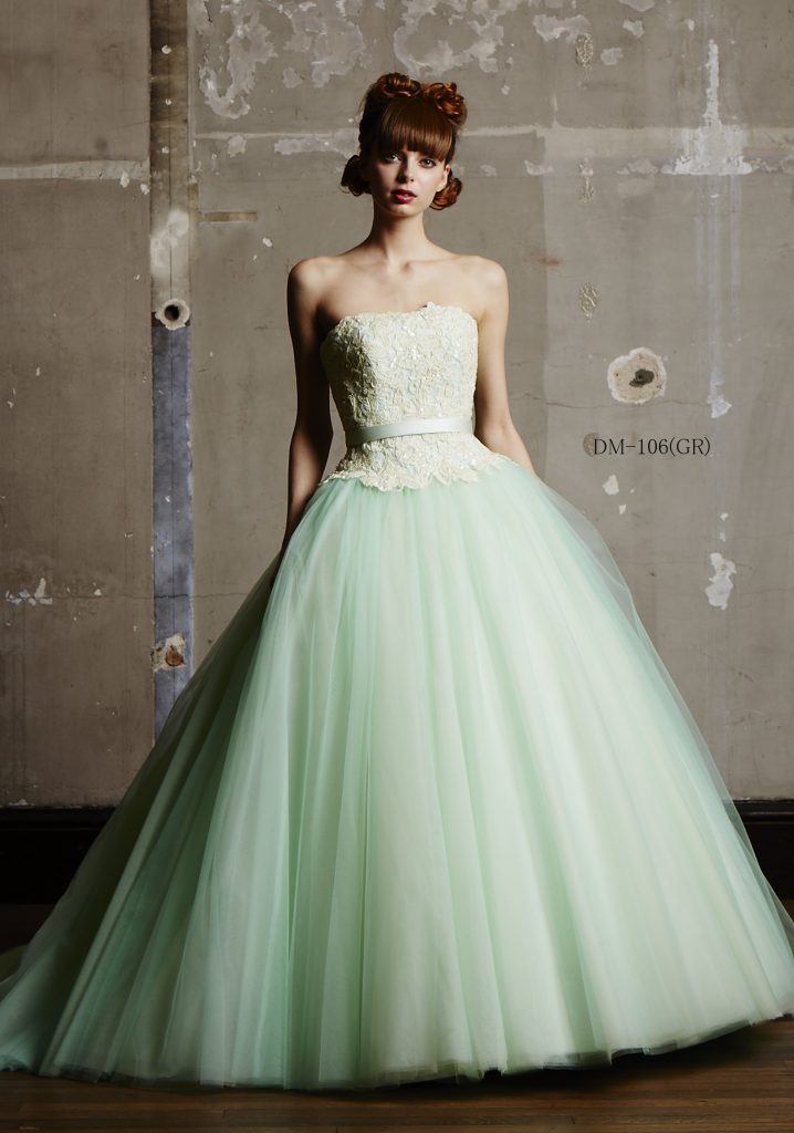 近頃よく耳にする『ナチュラル・ウエディング』。今カップルに人気のウエディングイメージです。そんなナチュラル・ウエディングにピッタリなのが、『KABU9』のカラードレス。柔らかなチュールを幾重にも重ねたバレリーナのチュチュを思わせるプリンセスライン、今年一番注目されているミントグリーン、胸元のケミカルレースを贅沢に施したトレンド感たっぷりの一着です。こだわり派のあなたは、会場の雰囲気に合わせてこのドレスを選んだら、さらにアクセサリーやブーケのトータルコーディネートで『自分らしさ』を楽しんでみて下さい。