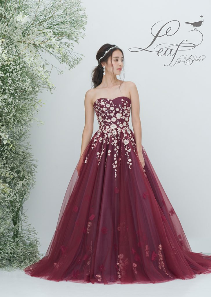 熟成されたワインのような色香を漂わせるドレスは、まさにエレガントな大人の女性にお勧めしたいドレス。胸元からスカートに施されたピンクベージュのフラワー刺繍は、どこか可愛らしく、少女の面影を感じさせます。「可愛らしさ&女性らしさ」を融合させた独特の世界観は、乙女心をくすぐるデザイナー「山城葉子」ならでは。スカートにチュールレースを重ね合わせる事で生まれる立体感が、上品な華やかさをより感じさせます。