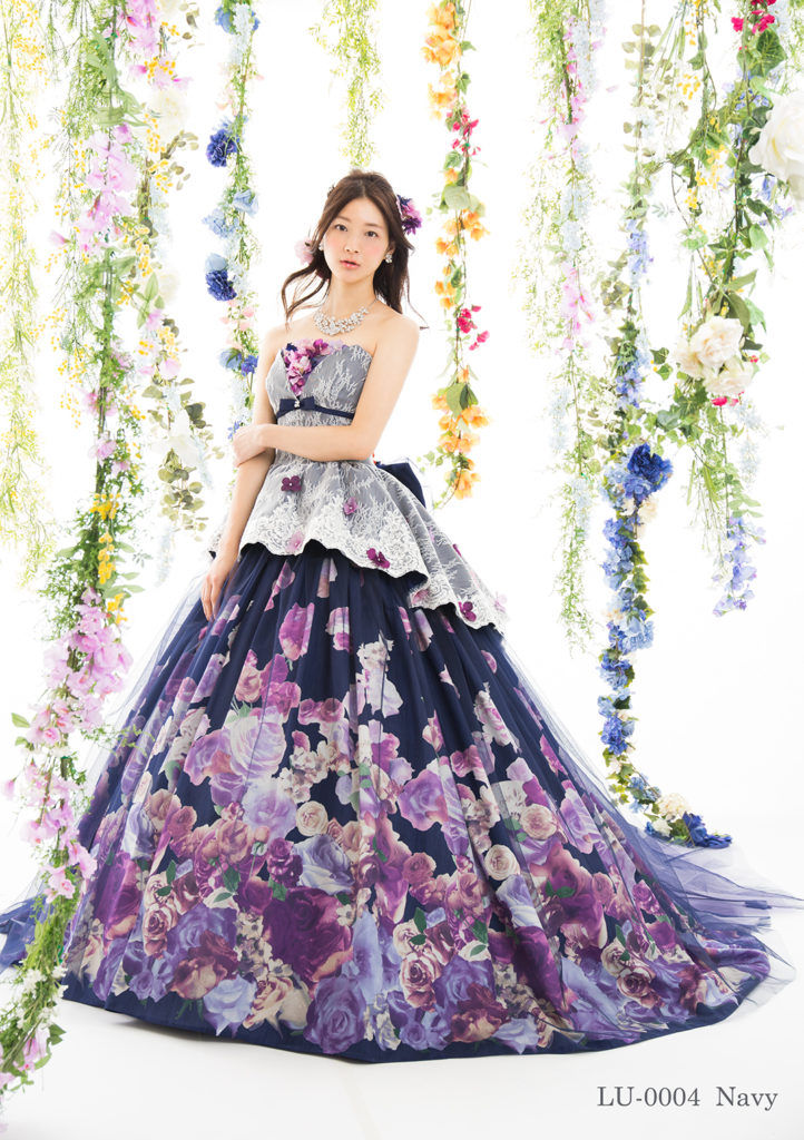 テーマは「360度 恋するドレス」。そのテーマの通り、可愛らしくて華やかなプリント柄のドレスは、どの角度から見てもゲストの皆様に華やかさを強く印象づけます。トップスにあしらわれた繊細なホワイトレースがアクセントとなり、可愛いだけではなく、女性らしい上品さも感じさせます。胸元にちりばめられた花びらが立体的でキュートなプリンセスドレスです。