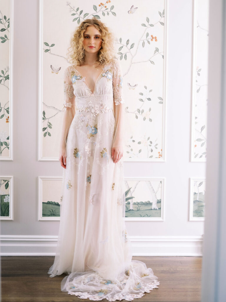 Claire Pettibone(クレア ペッティーボーン)デザインのクリサレス。リラックス感のあるスレンダードレスはチュールに施されたお花と蝶のカラー刺繍が優しくロマンティックな印象を与えます。透明感のあるフレアロングスリーブがガーデンパーティーにもお勧めのナチュラルなカラードレス。全身に輝くゴールドのグリッターが屋外でのカジュアルなパーティーにもピッタリ。