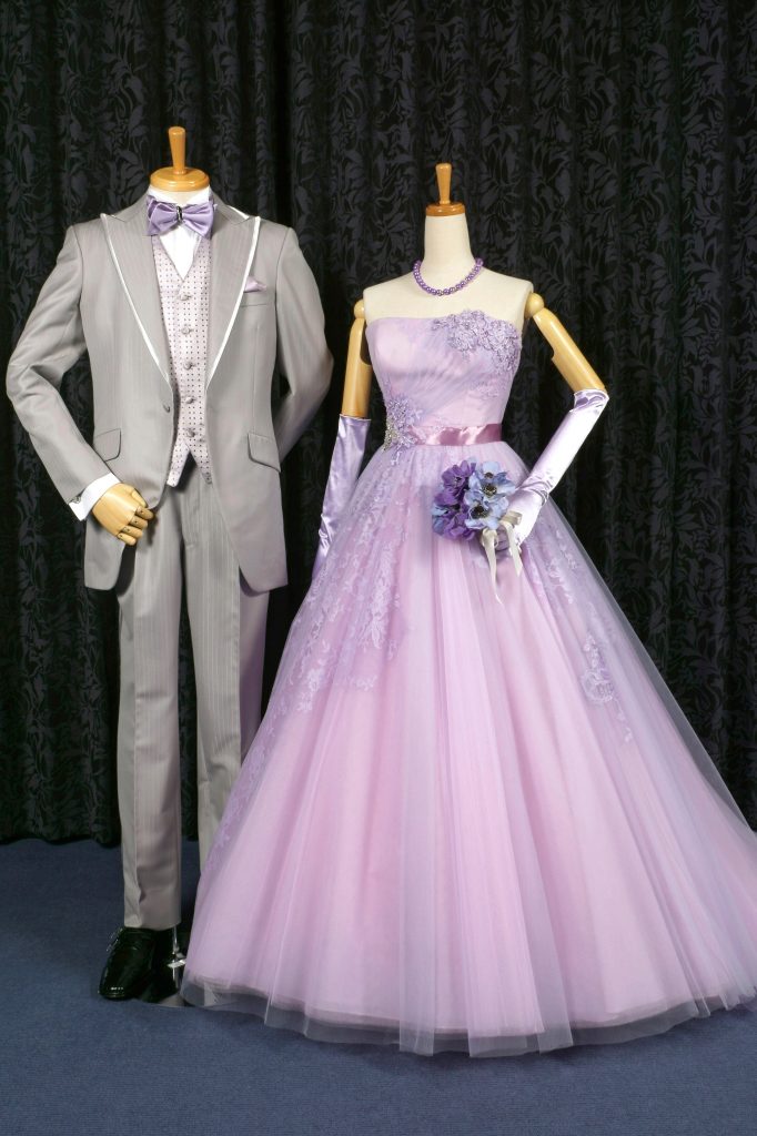 初々しい新郎新婦に、お薦めしたい爽やかなピンクラベンダードレスと、クリアグレータキシードのコーディネートです。タキシードには、ドレスと統一感あるラベンダー色のベストと蝶タイを組み合わせ、花嫁を優雅にエスコート。優しいイメージのチュールレースと、爽やかで上品なラベンダーカラーを組み合わせた『ラトリエマリアージュ』のドレスは、春から夏にかけて暖かくなるシーズンの、ガーデンパーティーやハウスウェディングにお勧めです。