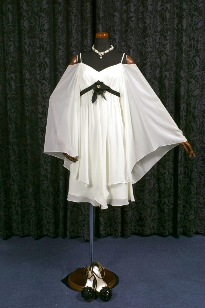 引き締め効果大の黒リボンを利かせたドレスは、足元も黒のパンプスを合わせることで、シックなモノトーンスタイルに。大胆なフレアスリーブとひらりと揺れるカスケードスカートが、妖精のような佇まいを感じさせます。トレンド感溢れるモダンなデザインのドレスなので、お洒落に敏感な花嫁様におすすめします。新郎様もダークスーツでかっこよくスタイリッシュに着こなし、二人のトータルコーディネートを極めましょう。