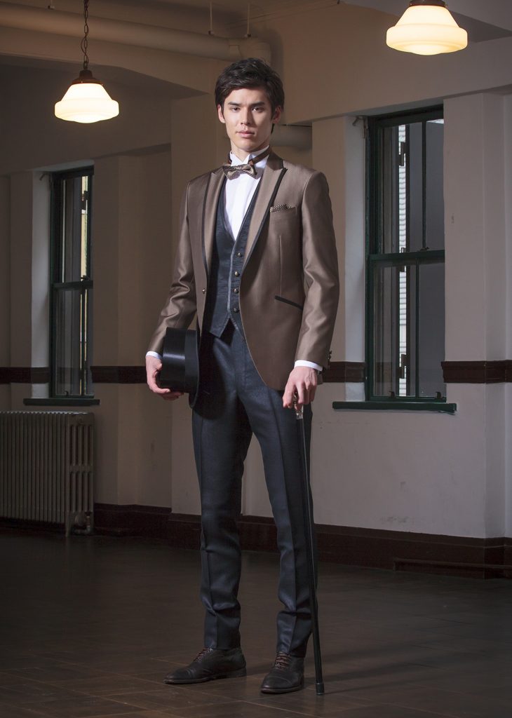 シックさが際立つブラウンタキシードは、ベストやパンツを、削ぎ落したシンプルなデザインにし、モノトーンの黒でより一層全体を引き締めます。スーパースリムな美脚パンツは、よりスタイリッシュに魅せます。カラードレスに合わせてベストの色を変えると、花嫁のドレスがより華やかに見え、雰囲気もガラリと変わります。上級者のコーディネ-トは、お二人が並ばれるとより一層輝き、幸せのオーラを放ちます。