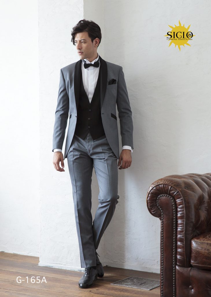 タキシードくらい男性が男らしく、上品かつ立派に見える服はありません。正統派のタキシードが、少しひねりの効いたショールカラーで登場しました。マットなグレーの色が、より一層お洒落心をくすぐります。黒のベストが、身も心も引き締め、もし迷ったら間違いない一着です。今を感じさせる短めの着丈に、タイトなパンツスタイルは、程良く体にフィットトし、前、横、斜め、後ろ、どこから見ても、ジャパニーズダンディの着こなしで、ゲストを釘付けにします。どんなカラードレスにも合わせ易く、ネクタイやポケットチーフで雰囲気を変える事ができます。