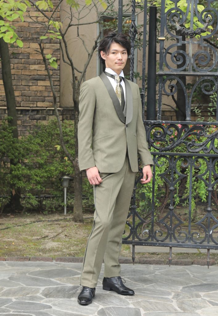 待望のカーキのタキシードが入荷しました。「ほかの友達と同じようなタキシードは着たくない。」そんなおしゃれな新郎様にぜひお勧めの一着。ボタニカル風の花柄の生地を重ねたデザイン性のあるネクタイもデザイナーこだわりのポイントです。パーティーはもちろん、ガーデンウエディングなどでの着用もお勧めです。