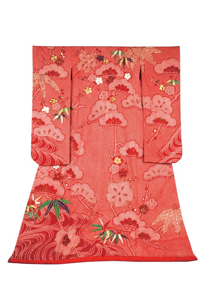 伝統的な文様の「松竹梅」。赤に浮かび上がった松と、梅の文様に竹を刺繍で重ねた、可愛らしくも力強い逸品。“真っ赤だと、きつく見えるから・・・”と「赤」に少し抵抗のある花嫁にぴったりの、柔らかな印象です。数ある「絞り」の打掛の中、一部に刺繍をあしらい、全体を絞りで仕上げた色打掛は、とても貴重で「福茂」でも、数枚しか手に入れられません。“他の人とは差を付けたい!”とお考えの花嫁に、お袖を通して頂きたいものです。