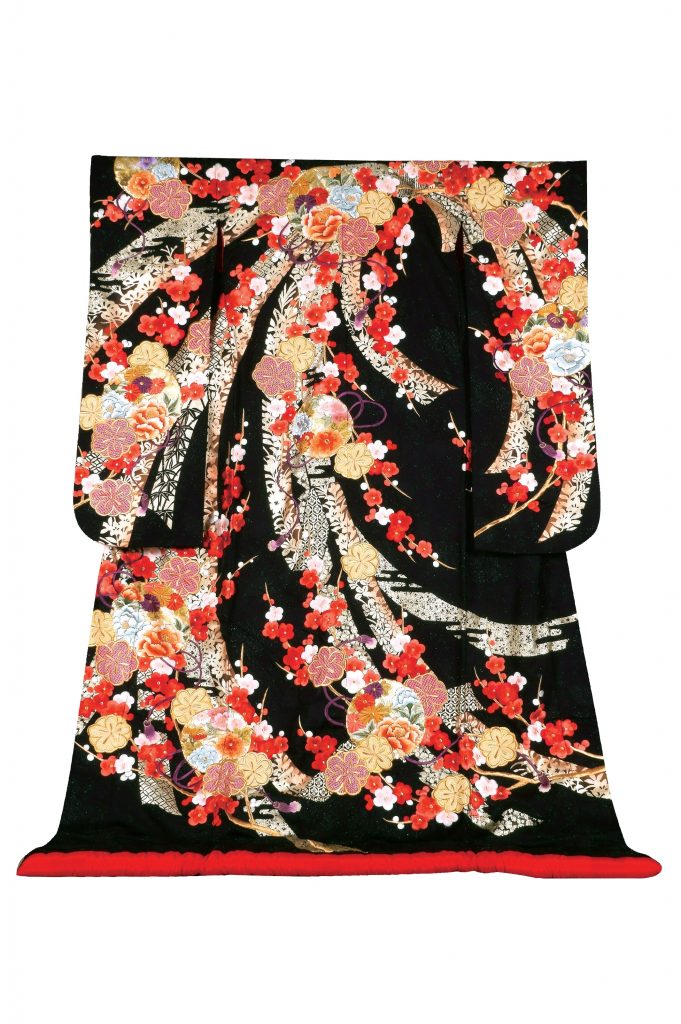 “黒地の打掛はシックすぎて抵抗がある・・・。”個性的な花嫁様にお勧めするのが、こちらの打掛。実は、色の中で一番派手に見えるのは、黒地の打掛です。結いあげられた黒髪に花嫁化粧、打掛は黒地に金糸が一緒に織り込まれており、重くなりがちな黒を、華やかに格調高く感じさせてくれます。そして、背中から流れる様に配された熨斗や、梅の刺繍が可愛らしさを添えてくれます。様々な種類の梅が描かれていますが、中でも「絞り」を使用して描かれた梅は「光琳梅」という図案化されたもの。梅の丸みを強調し、可愛らしさをより優しく表現しています。