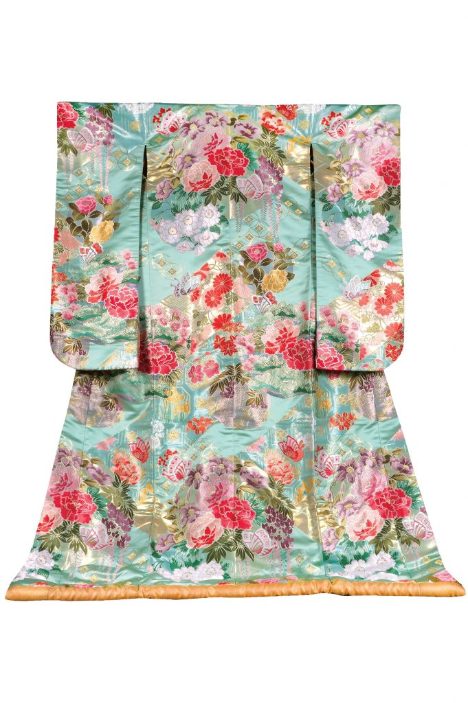 和装では珍しいぺパーミントグリーンの色打掛。近年、人気の洋髪とのコーディネートにお勧めしたい一着。鮮やかな色合いに咲き誇る美しい花々は、和と洋の融合を現したかのような、神秘的な美しさを秘めています。この打掛は、ドレスのデザインで有名な「神田うの」が手掛けたブランド『シェーナ・ドゥーノ』の傑作。固定概念にとらわれない、現代感覚をプラスした斬新なデザインで、会場を華やかに彩ってみてはいかがですか。