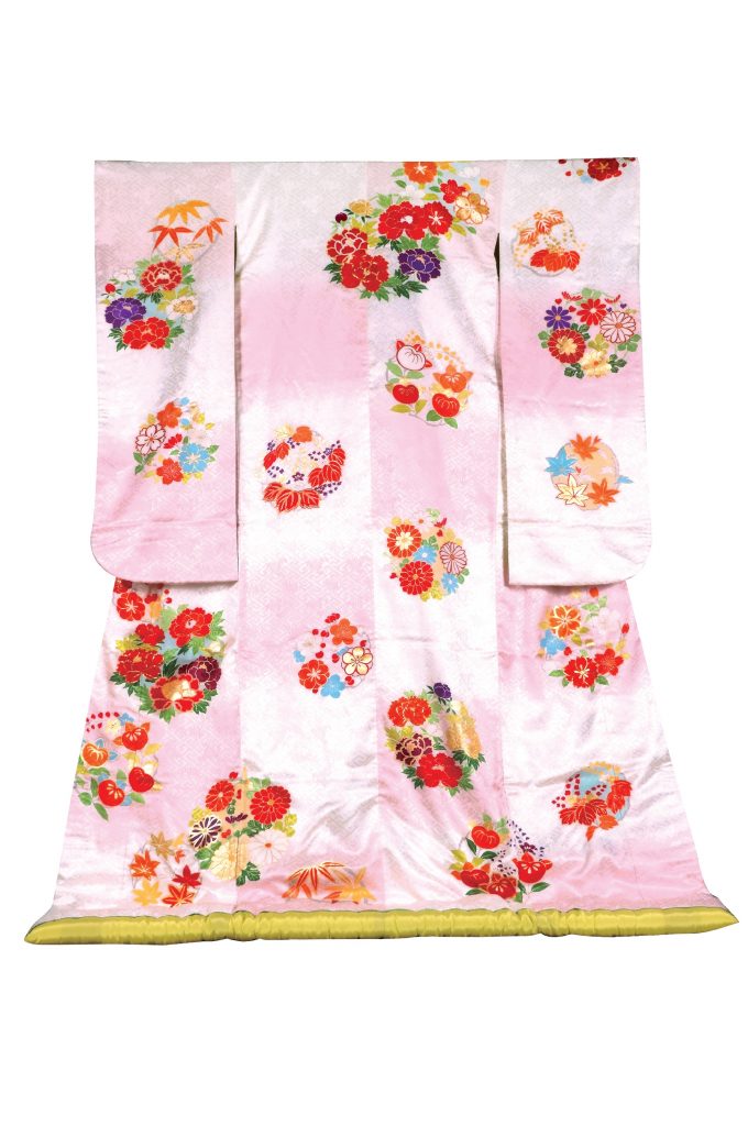 みなさん、4月の花と言えば・・・そう! 「さくら」 ですよね!!日本人は昔から、桜が咲くと、ウキウキ・・・ワクワク・・・不思議ですよね・・・!?誰もが好きな桜の色に染め上げた可愛らしい打掛。心を癒してくれる印象を受けます。裾に厚みを持たせた 「ふき」 の色合いは、春を思わせる若草色。春の雰囲気満載の一着は、緑美しい季節の、ロケーション撮影にピッタリです。勿論!最高級の日本製の絹を使用した生地は、まろやかな光沢感が美しく、ご披露宴会場を華やかに彩ってくれます。可愛らしい打掛をお探しの新婦様に、お薦めの一着です。