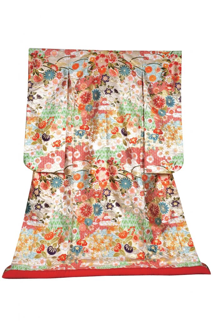 今、花嫁の間で人気なのが、白地の打掛。雑誌やインターネットでも、多く見かける様になりました。地色は白でも配された花々や有識文様が、美しく浮かびあがり、とても華やかな印象になります。打掛は、優しい色合いを何色も使い、日本の四季の移り変わりを表現しています。季節を表現するのは、日本人ならではの繊細な感覚ですよね。。。この打掛は、春・夏・秋・冬と、季節を問わずお召し頂けます。