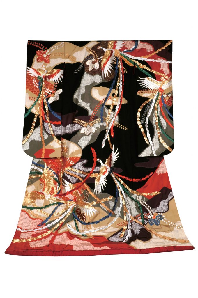 神話の中に登場する伝説の鳥 「鳳凰」が、大胆に刺繍された色打掛。躍動感のある図案は、まるで日本画を見ているかの様な美しさを感じさせてくれます。刺繍・染色・絞りなど様々な技法を駆使して作られているこちらの打掛。特に、浮かび上がる鳳凰の刺繍は、見事なまでに精緻で、日本の職人技術の高さを実感できることでしょう。芸術品と呼ぶに相応しい色打掛は、凛とした美しさのある衣裳をお探しの花嫁に、お召し頂きたい一着です。