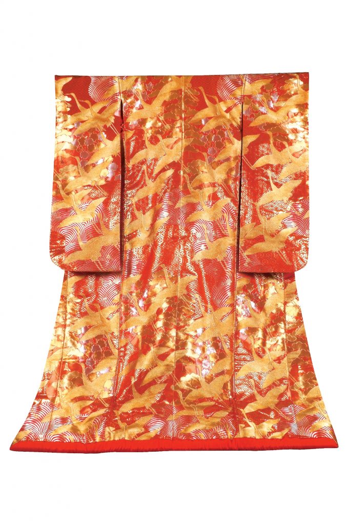 織物の代表格といえば 「川島織物」と云われるほど、歴史は古く、1843年にまで遡ります・・・。川島の打掛を扱っている衣裳店は、全国に数えるほどしかなく、永い歴史に裏打ちされた、クオリティ高い逸品が、福茂にございます。こちらの打掛は、朱色と金だけを使い表現された図案。上品でありながら、ゲストの視線を釘づけにするほどの華やかさが、他には無い圧倒的な存在感を感じさせてくれます。まさに芸術品と呼ぶにふさわしい一着で、一生に一度の花嫁姿を彩ってみませんか?