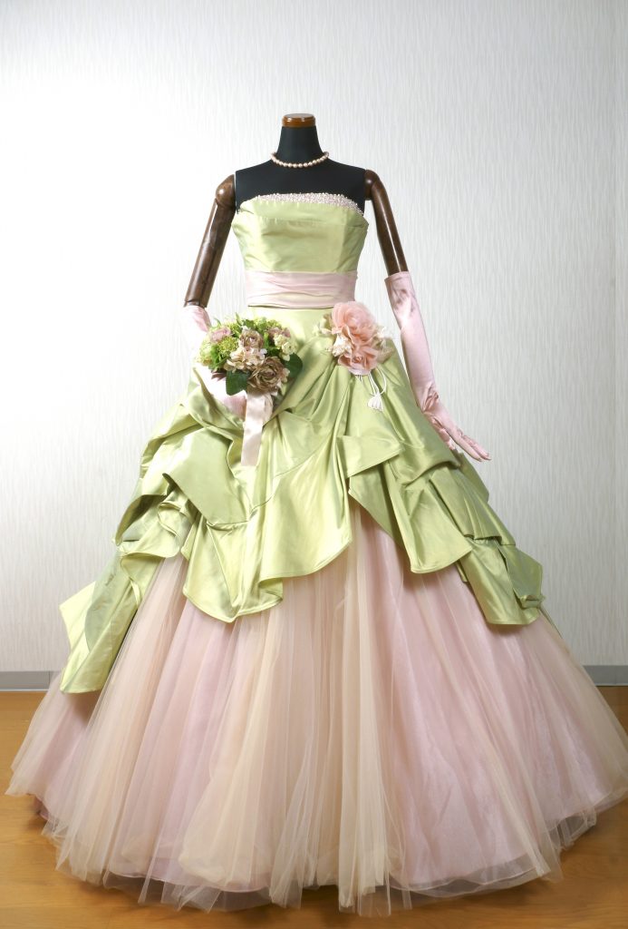 上品なピンクとミントグリーンのカラーコンビネーションが、斬新でゲストの目を引くモダンなドレスは、英国御用達ブランド「ハーディー・エイミス」の一着。上質なタフタはハリと光沢を生み出し、柔らかいチュールの異素材使いもインパクト大。胸元のクリスタルビジューは花嫁様の表情をより明るく華やかに魅せ、幅広のサッシュベルトがウエストラインを美しく魅せてくれます。アクセサリー・グローブ・ブーケに至る全ての小物を、ピンクの色目で統一することにより、小粋な花嫁様を演出してくれます。