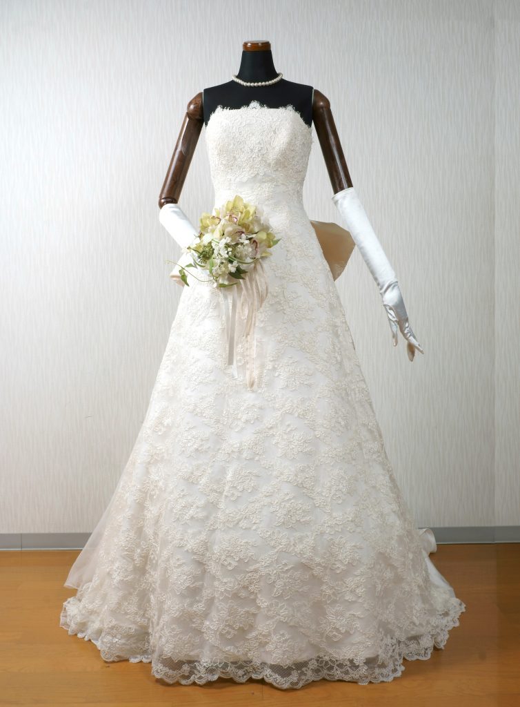 前から見た時と後ろから見た時に、デザインの少し違うドレスが気になる!と思いの花嫁様も多いはず。実はこのドレス、そんな花嫁様にぴったりです!!フロントデザインは、コードリバーレースの上品な雰囲気のAラインドレス。バックスタイルは、大ぶりなリボンとそこから広がるオーガンジーの柔らかいトレーンが、可愛らしさを感じさせるドレスです。見る角度によって印象が大きく違うドレスですが、360度どこから見られても、美しさ満開の自信が持てる一着です。ぜひ店頭でバックスタイルもご覧ください。