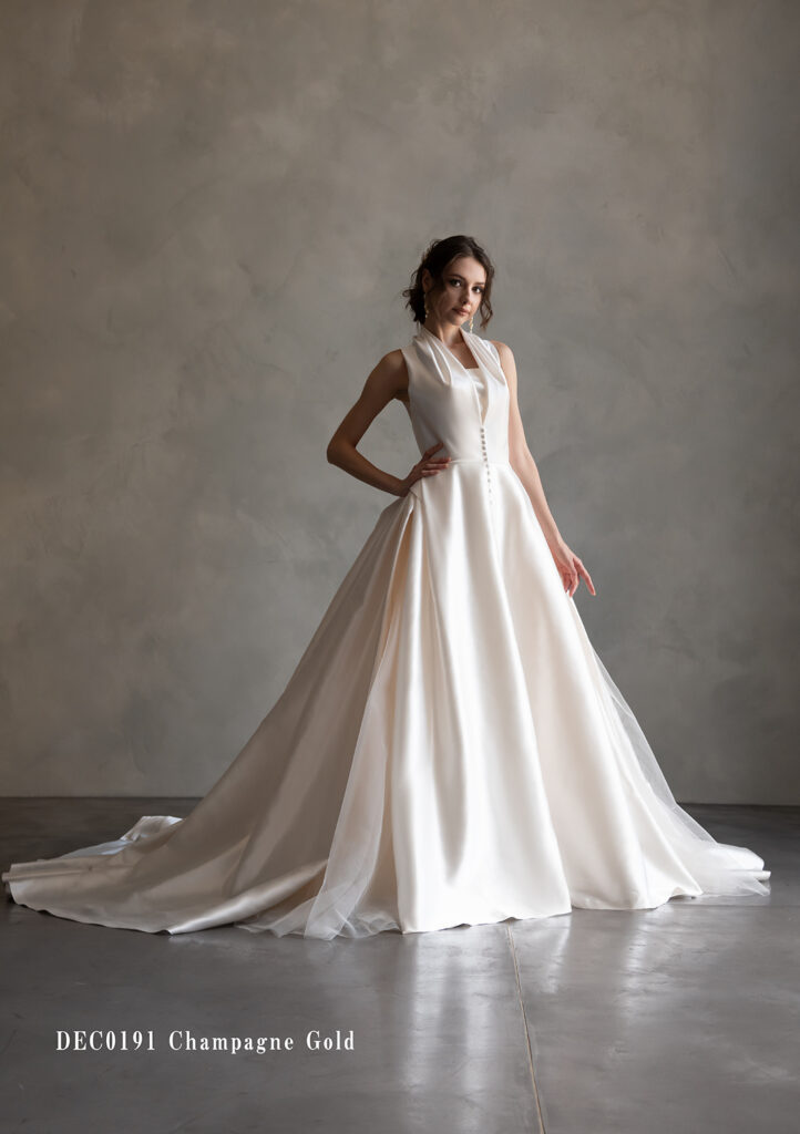 ドレープを施したホルダーネック風の見頃にナチュラルなシルエットのスカートを合わせたモダンスタイリッシュブライト。空気をはらんで美しく作り出すラインは動く度に形を変えていく新感覚スタイルです。