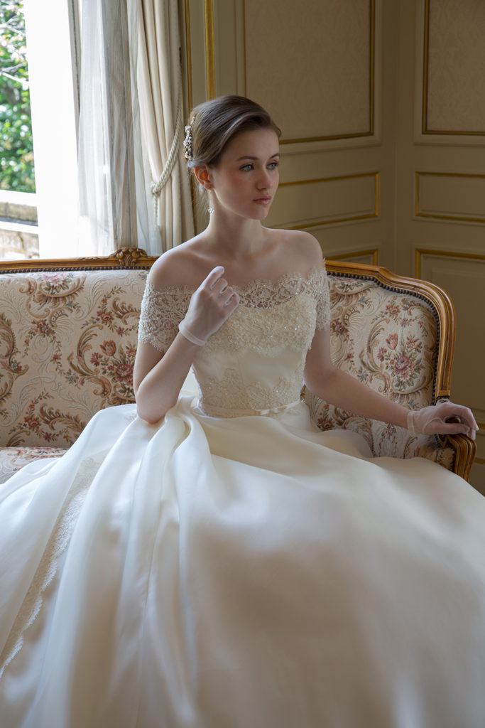 繊細なレースのオフショルダーボレロは、花嫁様のデコルテラインを美しく魅せます。ボレロを取り外すと、ハートカットのビスチエにもイメージが変わる2WAYタイプ。透明感ある艶やかなオーガンジースカートにヨーロッパレースを贅沢に使用したロングトレーンは、バージンロードを歩くお二人のバックスタイルを、より華やかに魅せてくれることでしょう…。