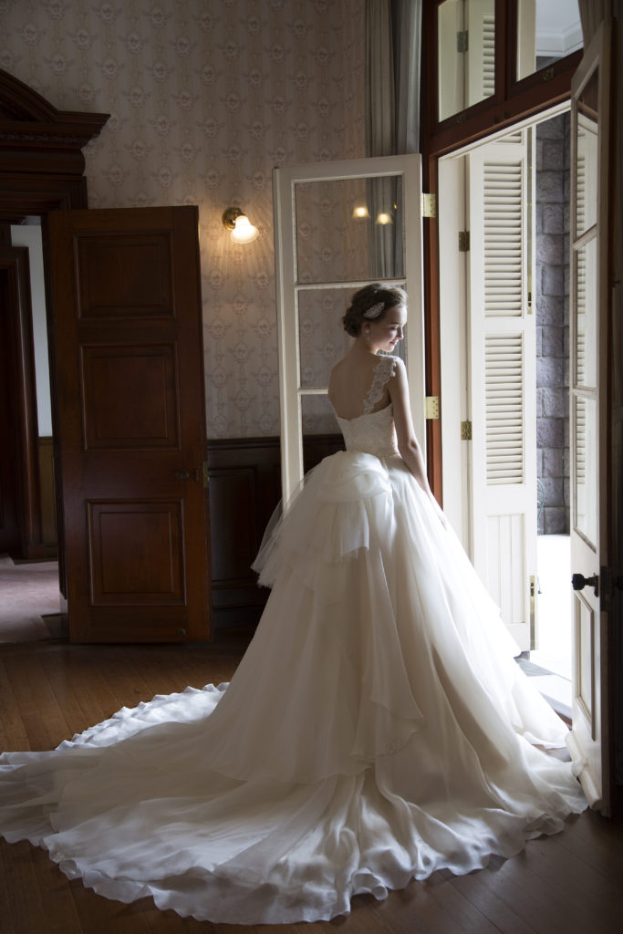 透明感あふれるオーガンジーを使用したスカートは、風が吹くとふわりと揺れ、柔らかい印象の花嫁に…。胸元のレースやビジューの繊細なデザインは、全てハンドメイドで作られているからこそできる特別なもの。優しいアイボリーの色合いは、厳粛な挙式にお勧めです。ショルダーレースとフラワーモチーフが、より華やかに見せてくれます。ウエストのフリルでバックスタイルまで美しい、完璧な花嫁姿を叶えてくれる事でしょう…。