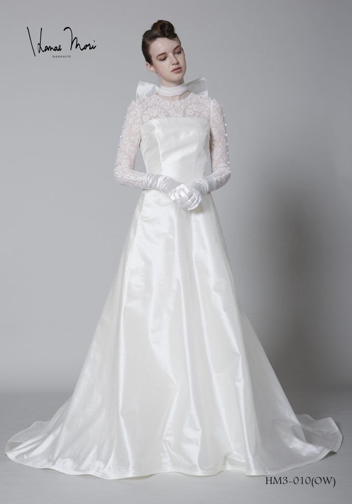 現在、ウエディングのトレンドの一つ、「大人クラシカル」。せっかくなら、ドレスも会場コーディネートに合わせたいものです。今、ロングスリーブのクラシカルな上品ドレスが人気上昇中!『ハナエ モリ』のロングスリーブドレスは、精緻なリバーレースと贅沢なシルク使いに心奪われる、エレガントが漂うドレスです。シンプルなドレスでありながらも、衿の後ろにデザインされた大ぶりなリボンが、『ハナエ モリ』の遊び心を感じさせます。シンプルかつ上品に仕上げられたドレスは、花嫁自身の美しさを最大限に引き立てます。