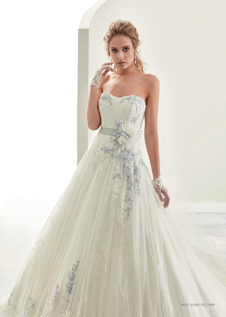 皆様は「サムシング・フォー」という海外の結婚式にまつわる幸せの格言をご存じですか。「サムシング・オールド(何か古いもの)」「サムシング・ニュー(何か新しいもの)」「サムシング・ボロード(何か借りたもの)」、そして最後が「サムシング・ブルー(何か青いもの)」…ブルーには“純潔・純愛”といった意味があります。ドレスに施されたブルー刺繍が清楚な印象の一着。ウエストにあしらわれたブルーグレーのリボンが、トレンドを感じさせ、挙式だけでなく、パーティースタイルとしてもお勧めの一着です。