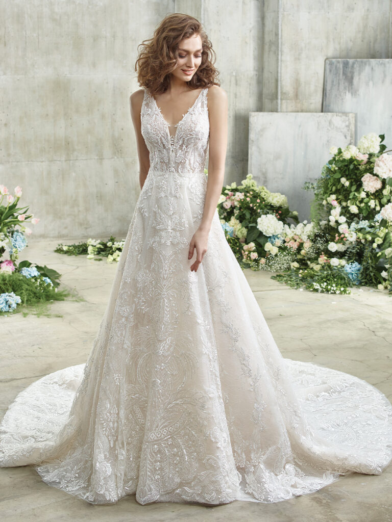大胆にカットされたVネックラインが、スタイリッシュで大人な花嫁様にお勧めの1着。さりげなくシースルーになっているデザインは、抜け感があり軽やかに着こなす事ができます。トレンドのグリッターの装飾は、360℃どの角度もキラキラで主役感間違いなしです。