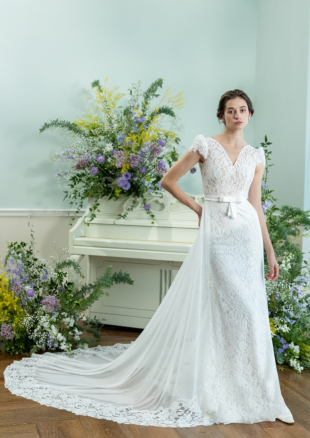 繊細なレースが全身を彩るエレガントなマーメイドドレス。女性ならではの、しなやかなラインを美しく魅せてくれるのは素材と縫製にこだわったオートクチュールだからこそ。小さく膨らんだ個性的なスリーブが、ロマンティックとクラシカルのバランスを絶妙に表現しています。シルクジョーゼットのオーバースカートがゆったりと広がり、大聖堂にも映える圧巻のバックスタイルです。