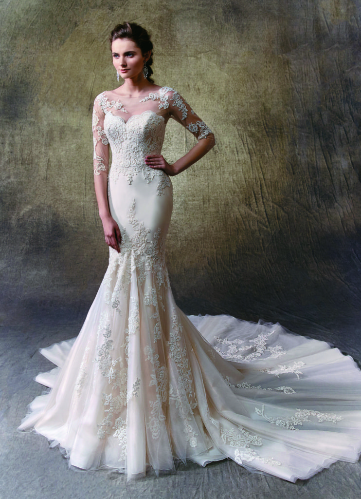 「スタイルに自信がないからちょっと…」と敬遠される方も多いマーメイドドレス。実は女性ならではのしなやかなラインが一番魅力的に見えるデザインです。繊細なチュールスリーブとドレス全体に施された大胆なレース、インポートならではの、息を飲むほど美しいドレスラインは、ゲストの皆様を魅了することでしょう。