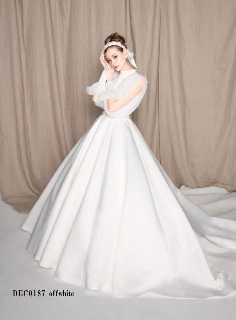 フランス語で “ 装飾の鍵 ”の意味を持つ、『Clef a décor』のドレスは素材にこだわり…建築的なパターンにこだわったシンプルな中に“ 装飾の鍵 ”となるポイントをちりばめた人気ブランド。クラシカルなムード漂うスタンドカラーの身頃は、スリットが施されたシフォンジョーゼットのロングスリーブでよりトレンド感のある一着に。ウエスト部分のパールベルトは、取り外し可能な2Wayタイプ。今までにない、クラシカルなデザインはゲストから絶賛されるに間違いなし!