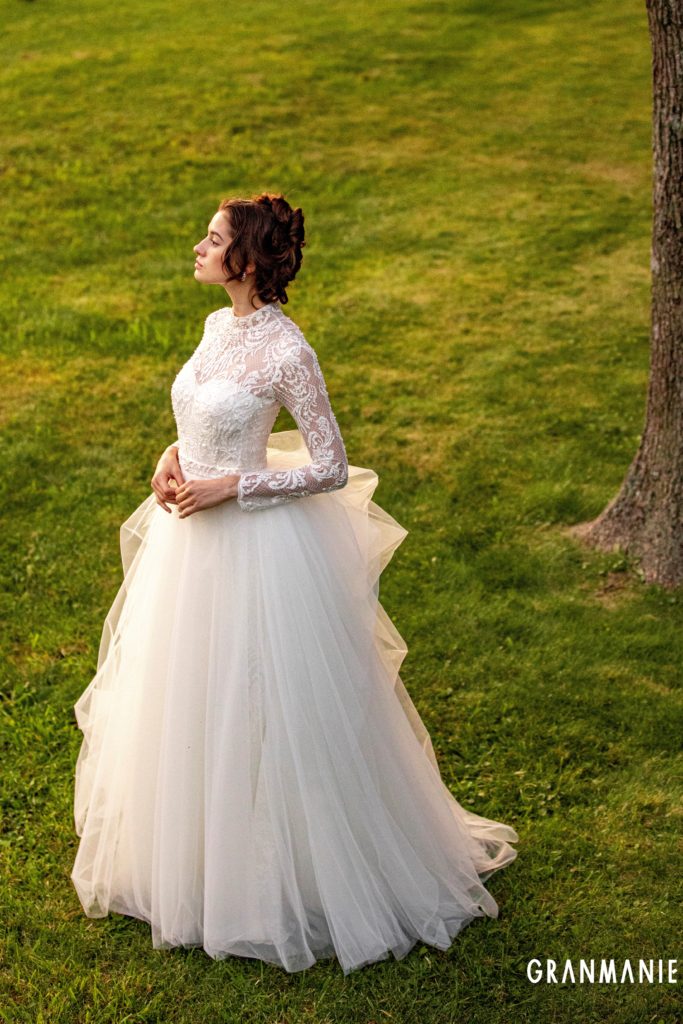 大胆かつ繊細なエンブロイダリーレースを上半身に施したドレスは、大切な結婚式を徹底的にこだわりたい花嫁にお届けしたい、オートクチュールブランド『グランマニエ』の傑作。ロングスリーブの繊細なレース、デザイン性のあるビーズ刺繍の美しさは、まさに芸術品。ヨーロッパの一流デザイナーが、女性の美しさを引き出すために考え抜き、それを職人技で縦糸のテンションを変えながら一針一針仕上げます。マーメイドラインだけでなく、付属のレースボレロやボリューム感あるスカートを組み合わせて、全く異なるスタイルもお楽しみいただけます。最高の一日にふさわしいドレッシーなドレスです。