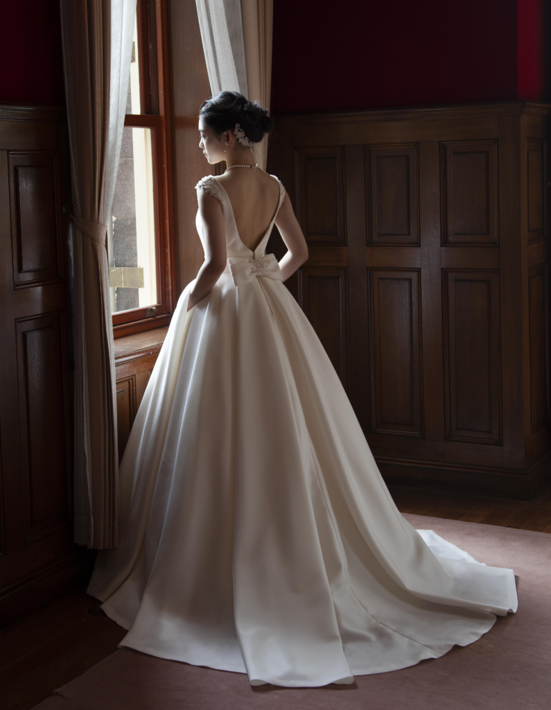 ミカドサテンの風合いを生かしたクラシカルなボートネックドレスは人気ブランド『カンタベッラ』のウエディングドレス。比較的詰まったイメージのラウンドネックの胸元に深めのVカットのバックスタイルが都会的な印象を与え、肩に施された立体的なケミカルレースがワンポイント。チャペルにもお勧めのクラシカルな一着です。