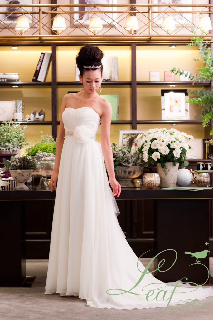 「レースやフリルなどの装飾は苦手…、でも女性らしさは必要…。」そんな悩める花嫁にお勧めしたいのは、日本人の“肌色”や“体型”に合わせて、細かくデザインされた、人気ブランド『リーフ・フォー・ブライズ』の一着。シンプルなデザインでありながら、柔らかなシフォンの素材感と、ストレートラインのドレープ、そして、ウエストのビジューベルトが、花嫁のスタイルをより一層美しく魅せます。アクセサリーやヘッドとのコーディネートも、色々楽しめます。透明感のあるスタイリッシュな雰囲気は、レストランウエディングにも、お勧めです!
