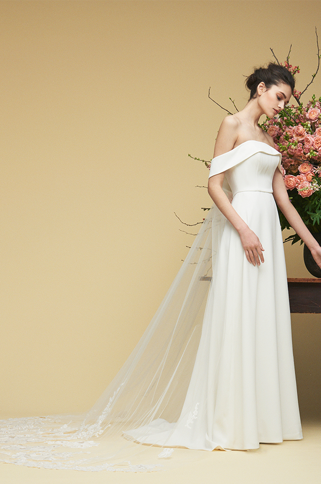 『リーフ・フォー・ブライズ』の新作ウエディングドレスが遂に入荷して参りました。一切の装飾を取り除き、上質なジョーゼットをシンプルなスレンダーラインにデザインしたドレス。緩やかなオフショルダーなど、現代のトレンドをしっかりと押さえた、デザイナー「山城 葉子」のセンスが光る一着です。シンプルなドレスとは対照的に、乙女心をくすぐるチュールトレーン…。贅沢なフラワー刺繍が施されたトレーンは、透明感を纏い、ゴールドやシルバーのストーンが幻想的な光を放っています。