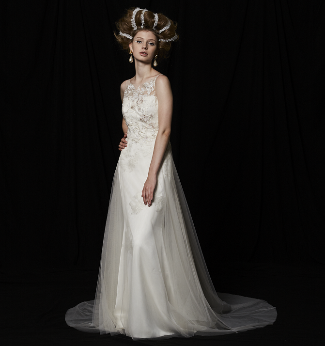 胸元の柔らかなチュールに施された繊細なレースが目を引くスレンダードレス。レースには淡いピンクの糸が使用されており、上品な女性らしさを演出します。ボリュームレスのスカートは動きやすく、ガーデンパーティーなどのゲストとの距離が近い結婚式をお考えの花嫁様にお勧めです。