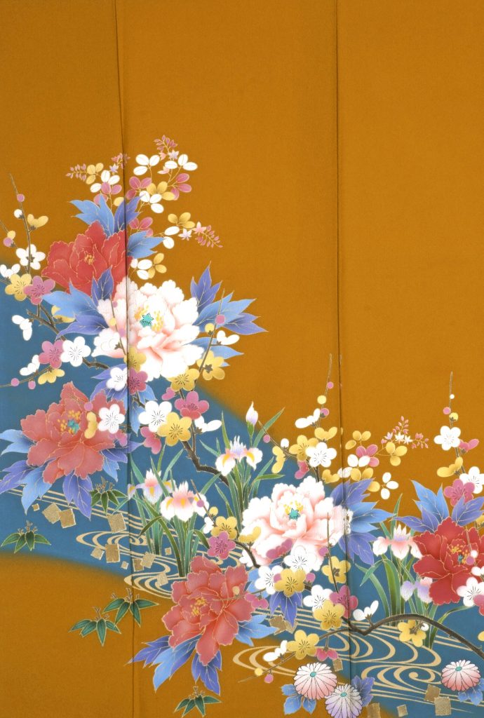 濃いめの辛子色の訪問着には、勇壮でもあり優美な印象を与える流水の文様。その中にダイナミックに描かれているのは富貴のシンボル牡丹・杜若・萩の花。萩は山野に自生し、紅紫色や白の小さい花をたくさんつける、秋の七草の一つです。他の季節の草花と合わせて、春秋の文様として愛好されています。はっきりとしたお色味が個性的で小粋な印象を与えます。20代から30代の方におすすめです。
